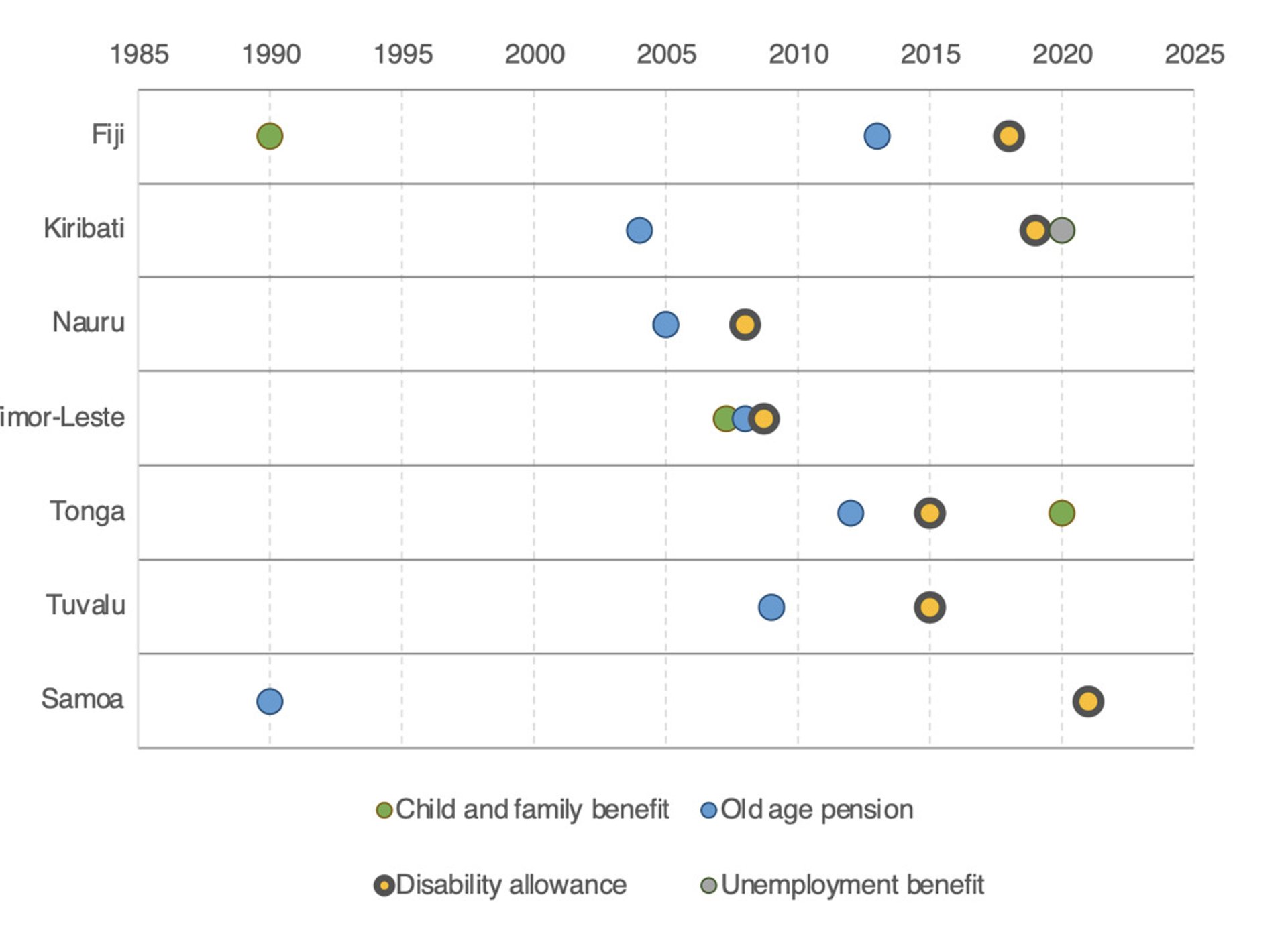 Figure 1 Year of introduction of tax-financed social protection benefits (1985-present), selected countries